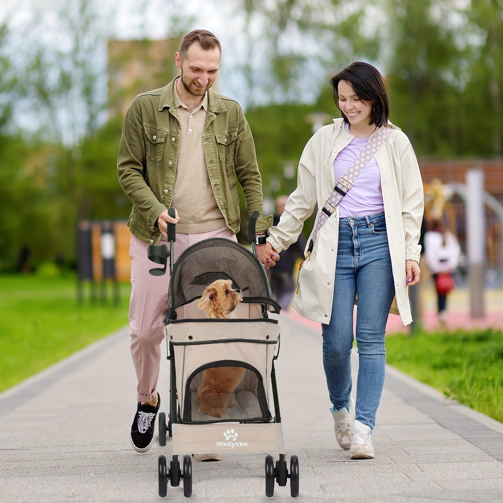 Take strolls with confidence in the Wedyvko Dog Stroller with Storage Basket and Mesh Canopy.