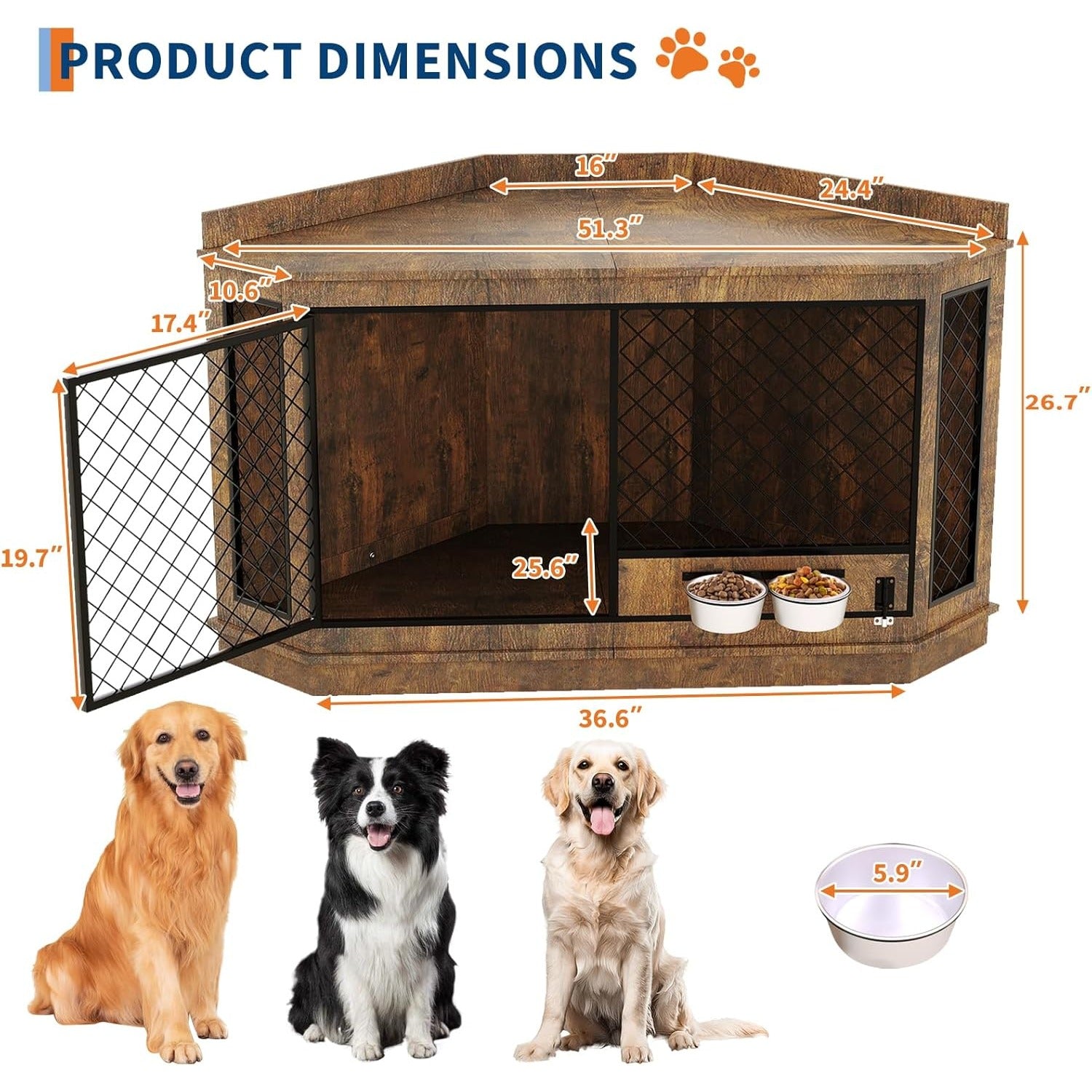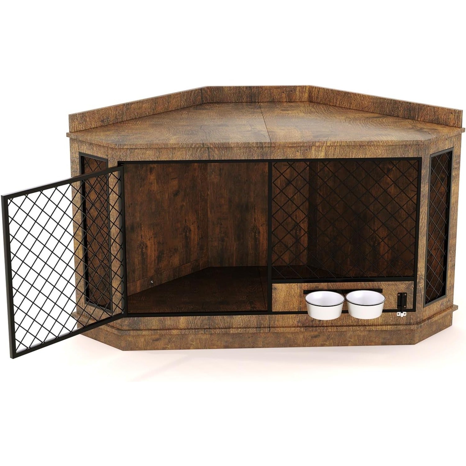 Transform your space with the GAOMON Corner Dog Crate End Table With Rotating Feeder, a stylish, space-saving solution for medium dogs.