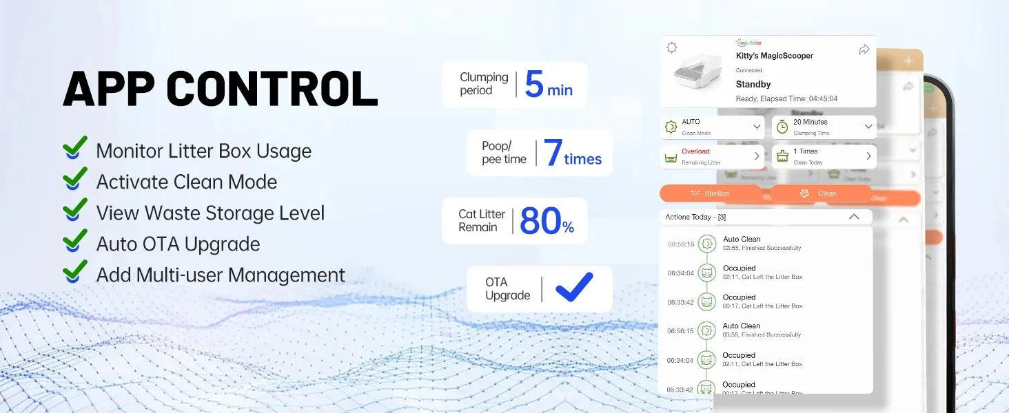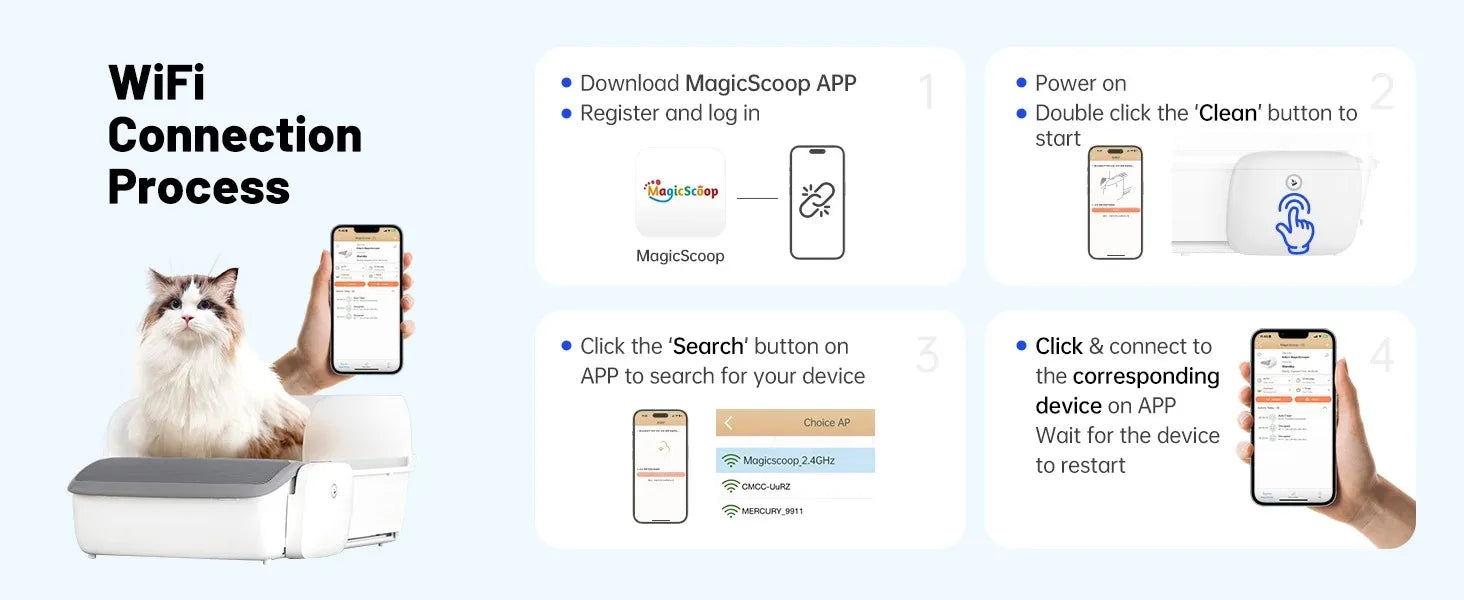- Smart MagicScoop App control on 2.4GHz WiFi delivers automatic cleaning, one-touch waste disposal, health monitoring, and shared access for family members.