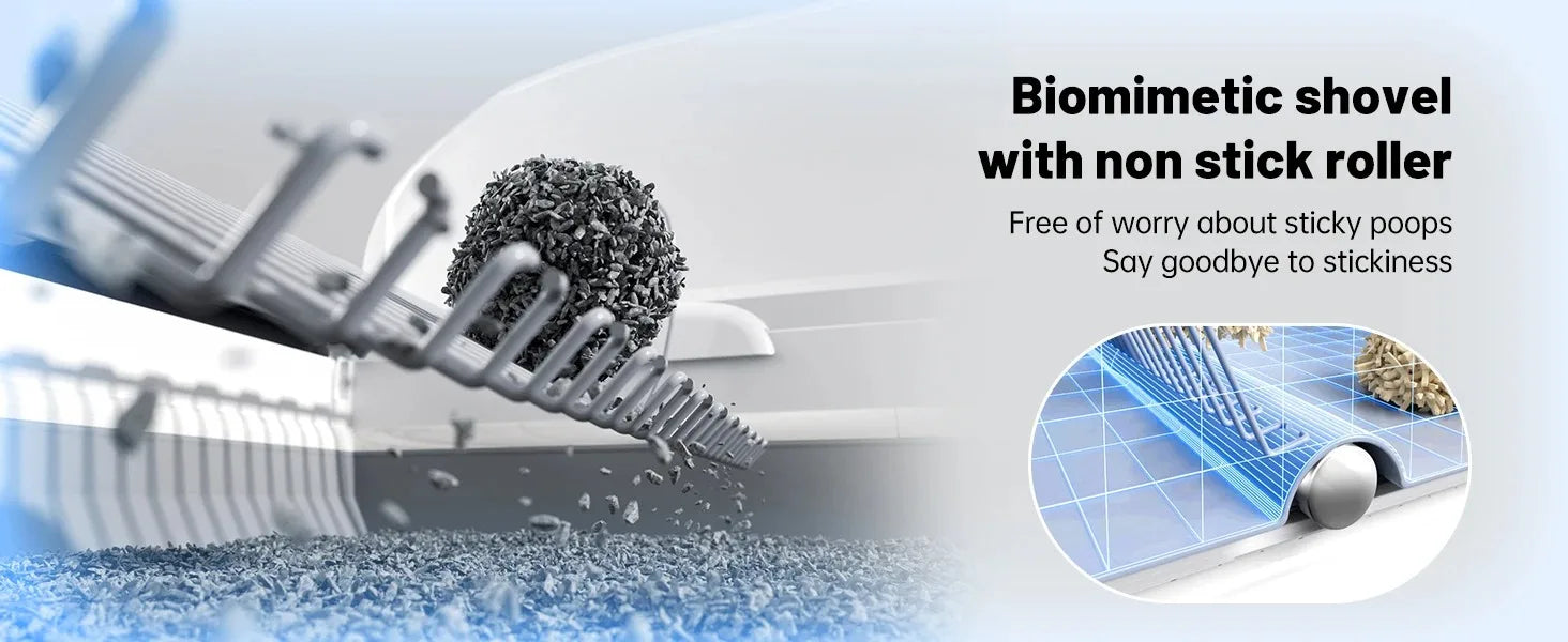 - Automatic cleaning with Bionic Scooping Technology and Anti-Stick Bottom eliminates scooping chores, keeps litter fresh, and reduces odor for you and your cats.