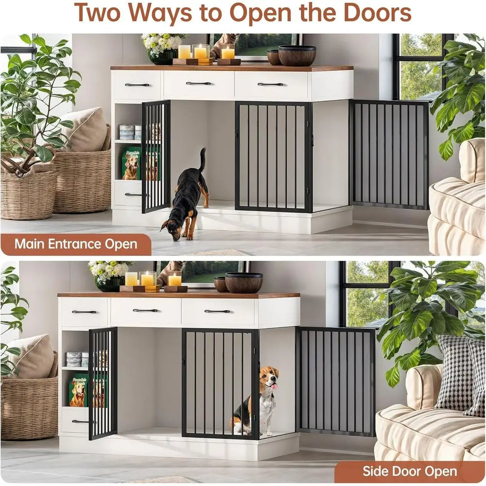 Wooden Dog Crate With Storage Drawers And Hidden Bowl Shelf